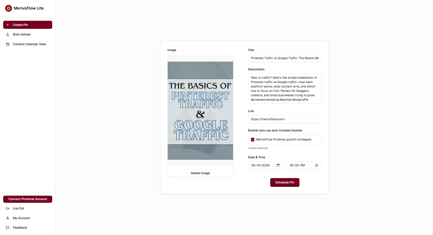 Upload your image, add your title and description, choose a board, and set the time. Done.
